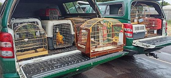A primeira ação foi realizada após denúncia. Em uma fazenda da região, agentes encontraram diferentes espécies sem autorização, entre elas arara-canindé, papagaio-verdadeiro, papagaio-do-mangue e maracanã-da-cara-amarela. Algumas aves estavam acorrentadas, enquanto outras eram mantidas em gaiolas trancadas com cadeados. Cinco delas integram a Cites II, lista internacional que controla o comércio de espécies ameaçadas. Todo o plantel foi apreendido.